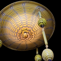 Lampadario in vetro a murrine zolfo, blu e lattimo, formato da grande coppa centrale e tre diffusori a pigna. Sostegni in ottone rivestiti da canne vuote e perle a murrine.